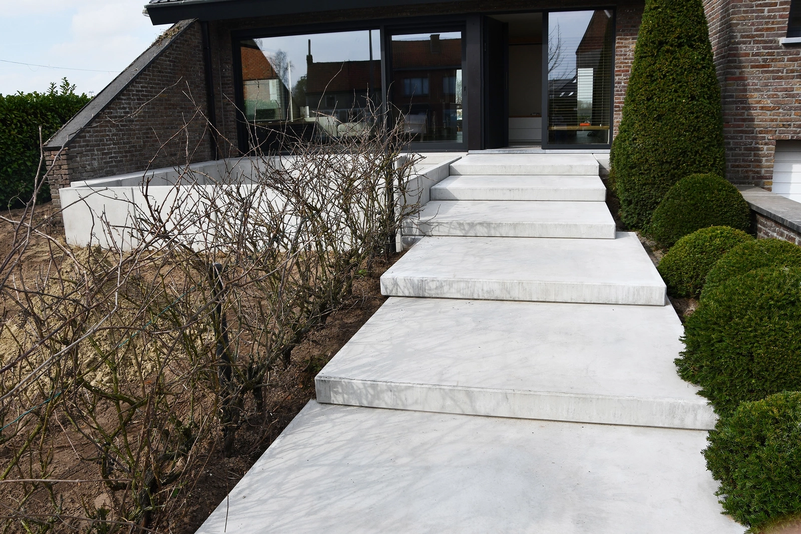 Dieses Projekt ist wirklich einzigartig! Bis zur Eingangstür dieser Villa wurden Trittsteine in verschiedenen Formaten verlegt. Außerdem wurde ein niedrigerer Sitzbereich mit 1,5 m hohen CLF10GS L-Steine geschaffen, die mit Stufen ausgestattet sind. Auf diese Weise sind die Bewohner vor dem Wind geschützt und haben einen Platz außerhalb der Sichtweite, der sich auch für den Empfang von Gästen eignet. Ein überraschendes und originelles Konzept.