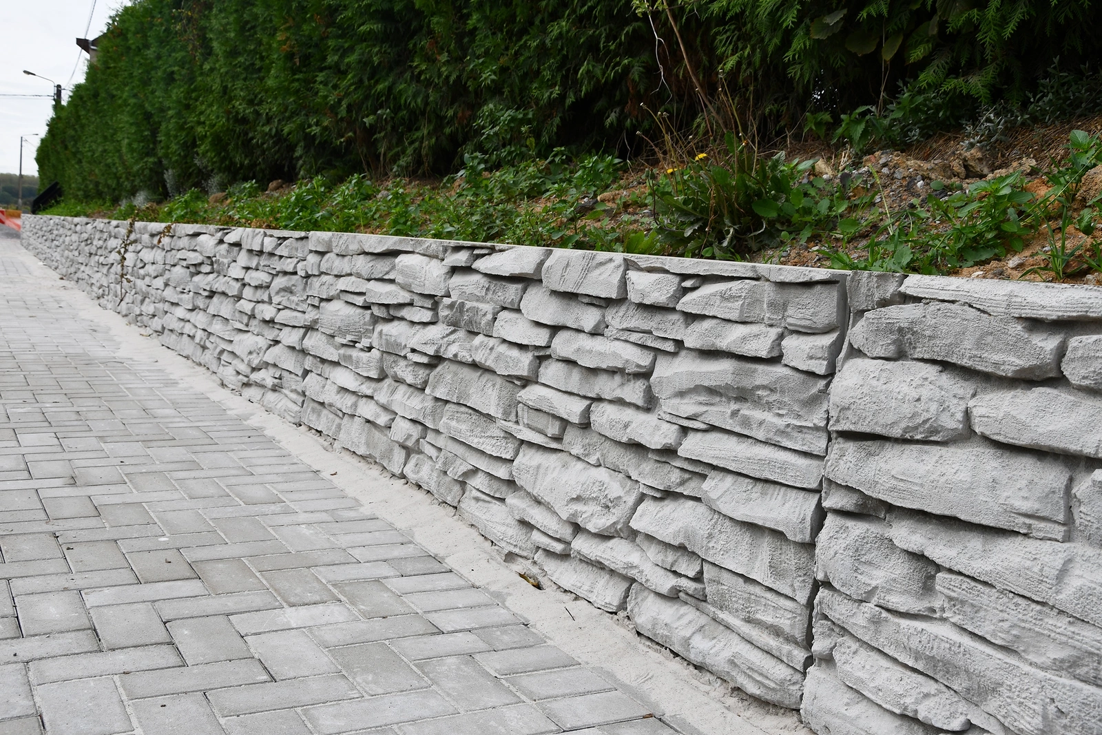 CBS Beton produit également des murs de soutènement qui peuvent être gaufrés et texturés différemment, ce qui leur permet de s'intégrer à l'environnement existant. Cela leur permet d'être à la fois fonctionnels et esthétiques. Le motif Brabant utilisé à Wangenies est un exemple de la façon dont ces motifs peuvent être utilisés pour créer un attrait visuel tout en remplissant leur fonction structurelle, comme le maintien de la pente par rapport à la rue. Ils embellissent l'environnement et préservent également le caractère du paysage.