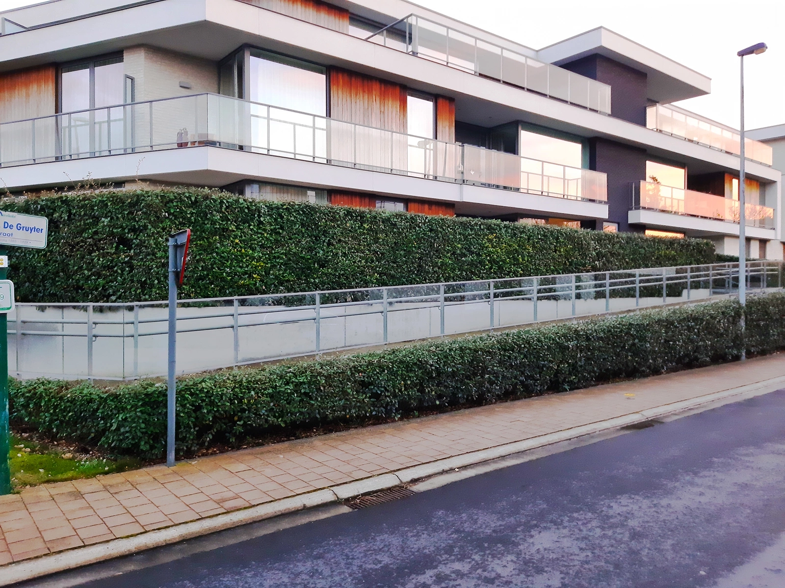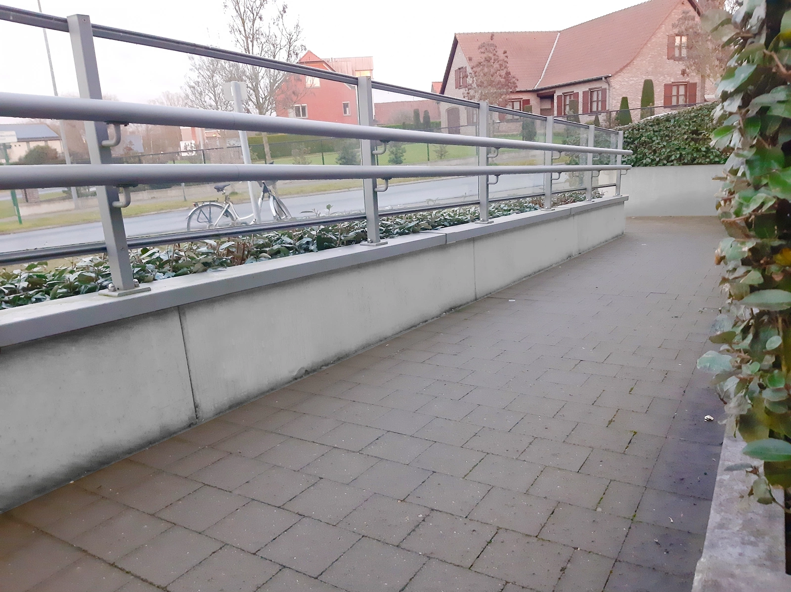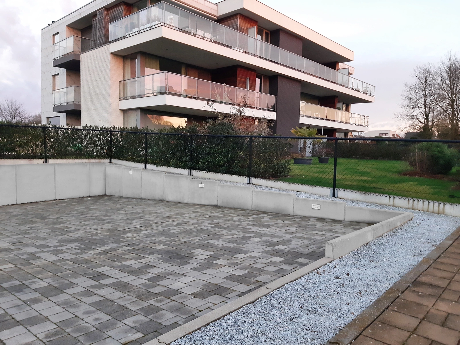 Voor dit appartementencomplex in Merelbeke werden verschillende CLF10GS wanden voorzien voor de inrit van garages, parking, ingang appartementsblok en een oprijstrook voor rolstoelgebruikers. Zoals je ziet, zijn er heel wat mogelijkheden voor maatwerk in keerwanden.