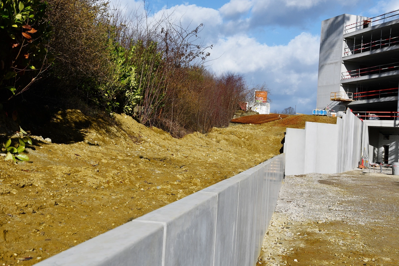 Voor de oplopende hoogte van 3 tot 5 m werden keerwanden van het type CLXA op maat gemaakt en in bocht geplaatst.