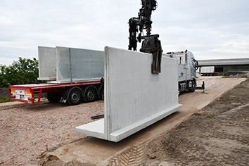 Deze Wanden zijn Benor gecertificeerd met een lengte van 5M per wand en een gewicht van 5900kg per wand. De wanden werden op een afstand geplaatst van 10 m en een lengte van 2 x 45 M. De afwerking van de grond is gebeurt met asfalt.