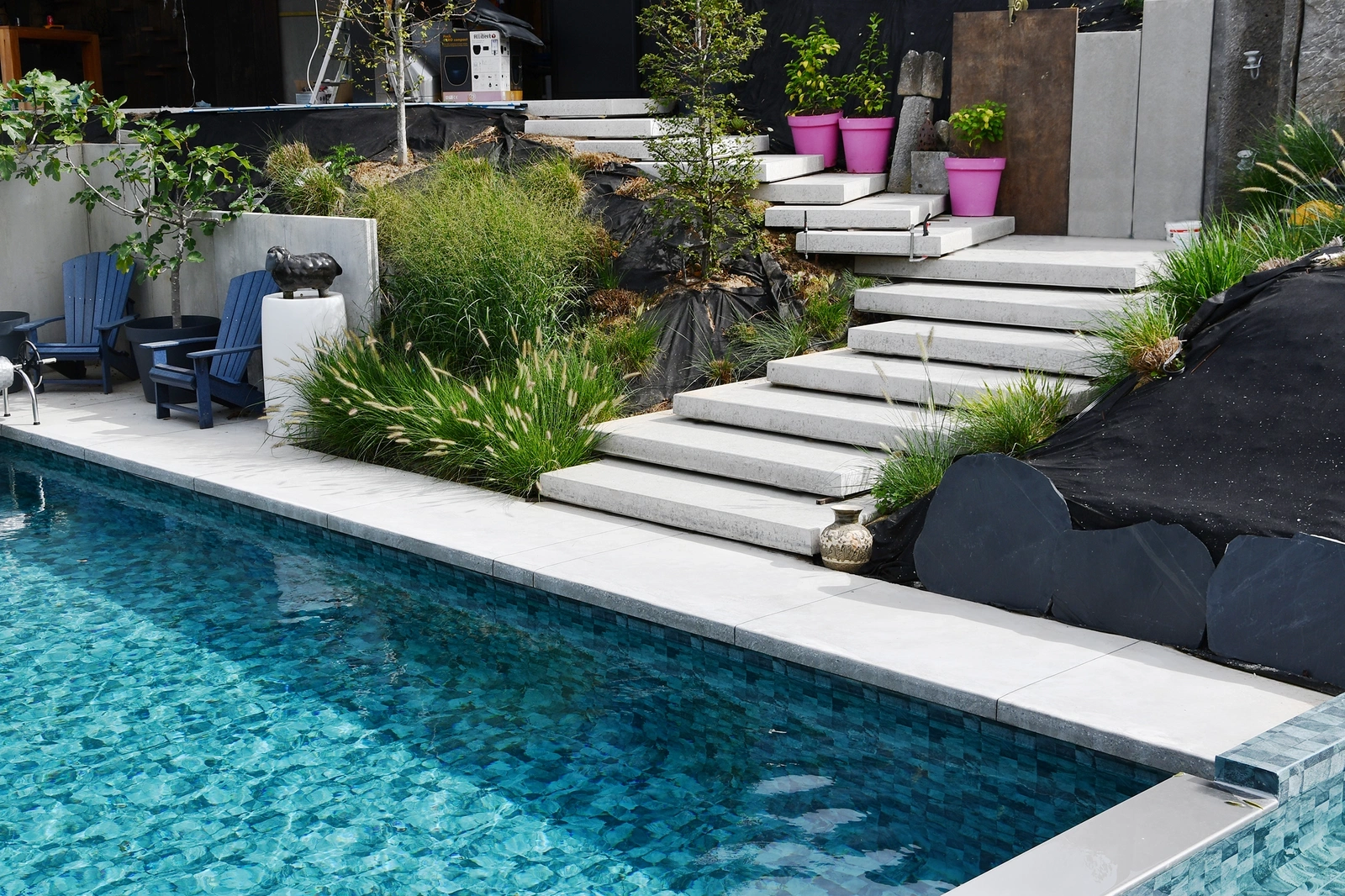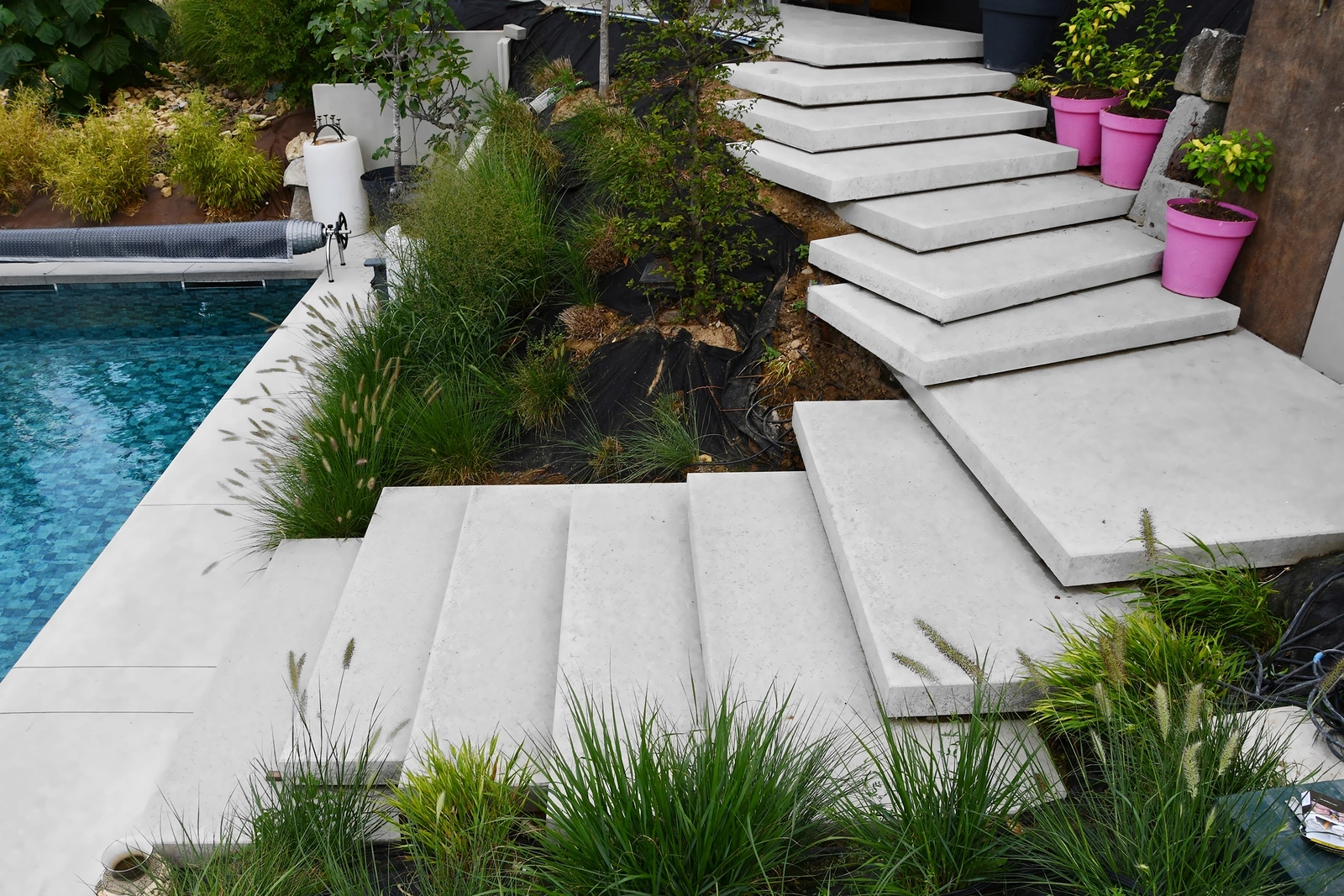 Voor dit project in Houtain-Le-Val werd voor het privézwembad een volledige helling op een creatieve manier aangelegd met vloerplaten tot aan de poolhouse. Rondom het zwembad werden stapstenen en CLF10GS-keerwanden geplaatst om de helling te ondersteunen. Ook de oprit werd voorzien van keerwanden. Een veelzijdige variatie van verschillende betonelementen.
