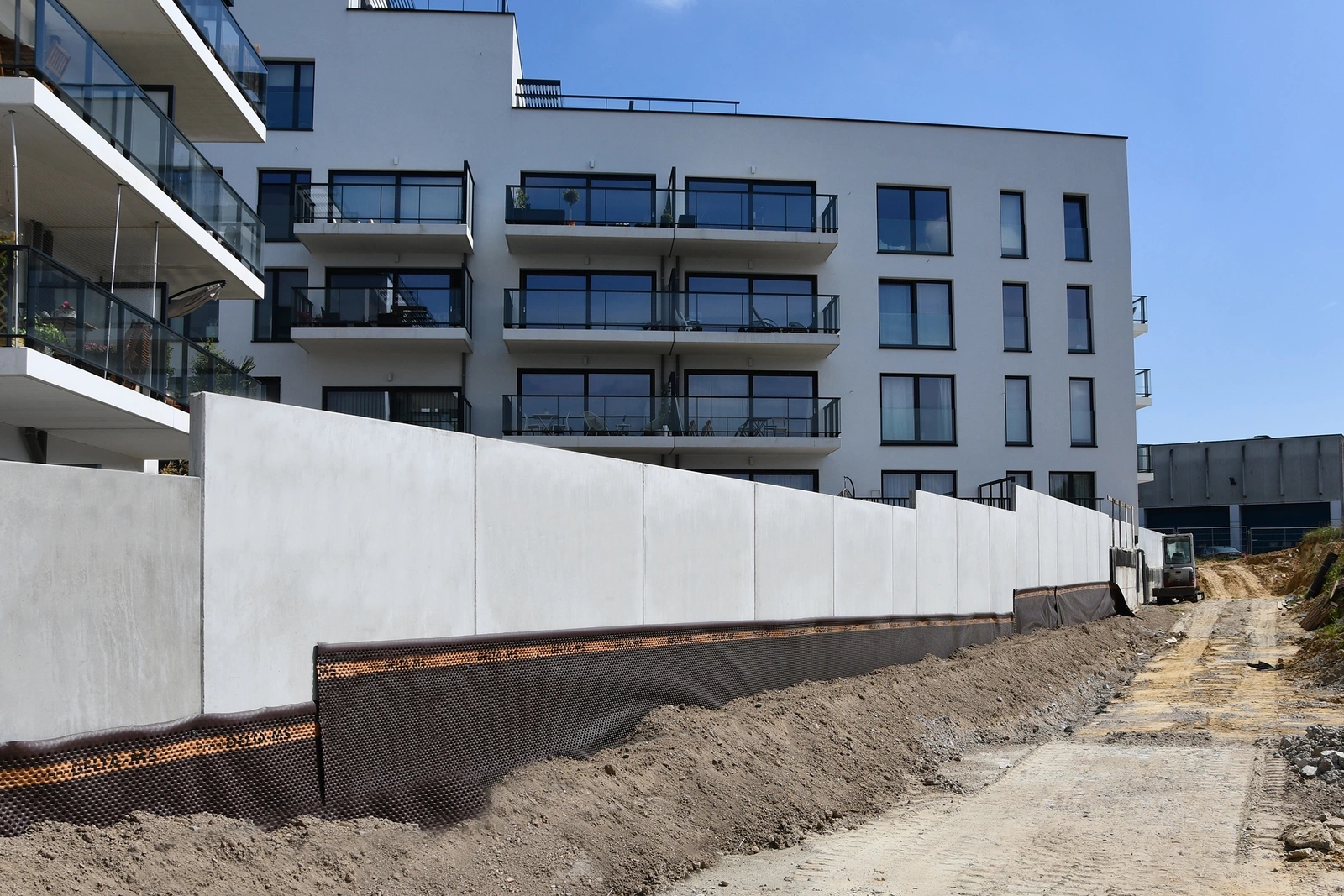 Voor dit appartementencomplex in Anderlecht heeft onze klant gekozen voor de hoogwaardige CLF10GS keerwanden van CBS Beton. Deze keerwanden, bekend om hun duurzaamheid, gladde afwerking en esthetische eigenschappen, dienen als een perfecte oplossing om de terrassen van de onderste appartementen op een functionele en visueel aantrekkelijke manier af te sluiten. Bij CBS Beton zetten we ons in voor het leveren van kwaliteitsproducten die voldoen aan de hoogste normen in de bouwsector.